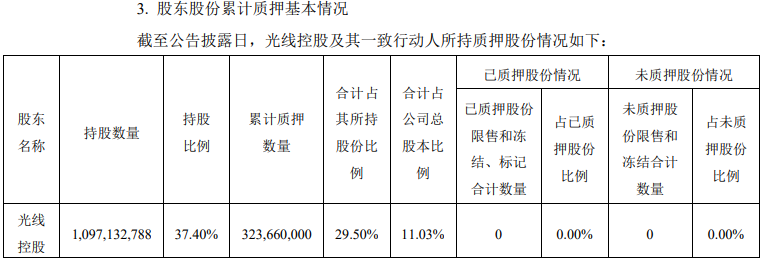 截至公告披露日,光线控股及其一致行动人持股数量10.97亿股,持股比例37.40%累计质押数量3.24亿股,合计占其所持股份比例29.50%合计占公司总股本比例11.03%