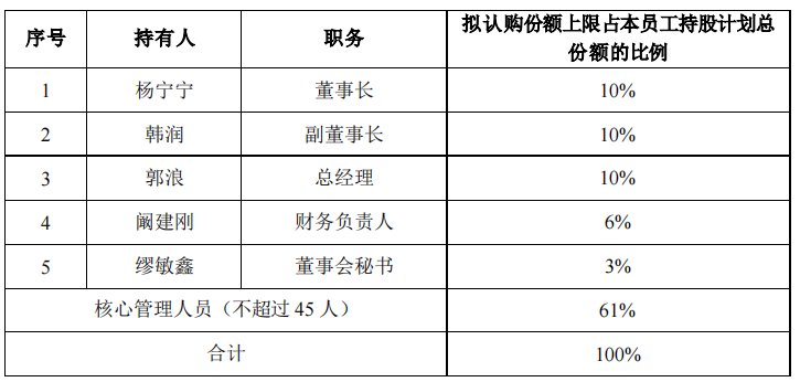本次员工持股计划持有人总人数预计不超过50人。董事长杨宁宁、副董事长韩润、总经理郭浪、财务负责人阚建刚、董事会秘书缪敏鑫拟认购份额上限占员工持股计划总份额的比例合计达39%。