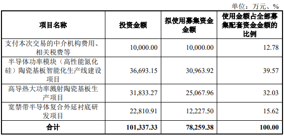本次募集配套资金用途如下:支付本次交易的中介机构费用、相关税费等;半导体功率模块(高性能氮化硅)陶瓷基板智能化生产线建设项目;高导热大功率溅射陶瓷基板生产项目;宽禁带半导体复合外延衬底研发项目。