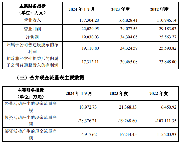 2022年度、2023年度、2024年1-9月,标的公司营业收入分别为110,746.14万元、166,828.41万元、137,304.28万元,净利润分别为25,563.77万元、34,394.05万元、19,030.03万元,归属于公司普通股股东的净利润分别为25,590.82万元、34,324.59万元、19,110.80万元,扣除非经常性损益后的归属于公司普通股股东的净利润分别为23,848.00万元、30,465.08万元、17,312.11万元,经营活动产生的现金流量净额分别为6,450.92万元、21,368.33万元、10,972.73万元。