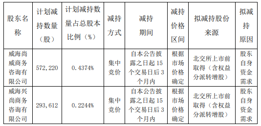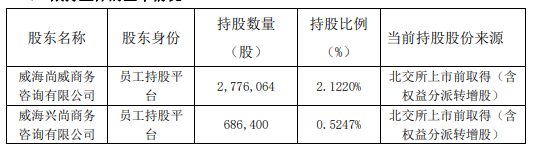 威海尚威商务咨询有限公司目前持股数量为2,776,064股,持股比例2.1220%;威海兴尚商务咨询有限公司目前持股数量为686,400股,持股比例0.5247%。股份来源均为北交所上市前取得(含权益分派转增股)。