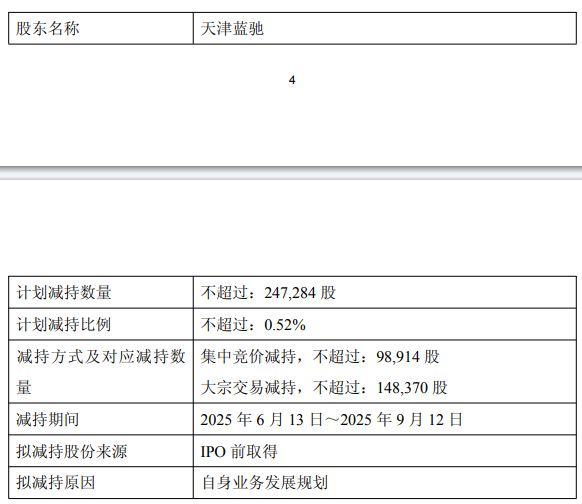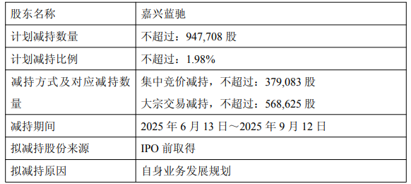 嘉兴蓝驰、天津蓝驰根据自身业务发展规划,计划通过集中竞价及大宗交易 方式减持其持有的公司股份合计不超过1,194,992股,减持比例不超过公司总股本的2.50%。其中:拟通过集中竞价方式减持不超过477,997股,即不超过公司总股本的1.00%,自减持股份计划公告披露之日起15个交易日后的3个月内进行,且任意连续90日减持股份总数不超过公司总股本的1.00%;拟通过大宗交易方式减持不超过716,995股,即不得超过公司总股本的1.50%,自减持股份计划公告披露之日起15个交易日后的3个月内进行,且任意连续90日减持股份总数不超过公司总股本的2.00%。