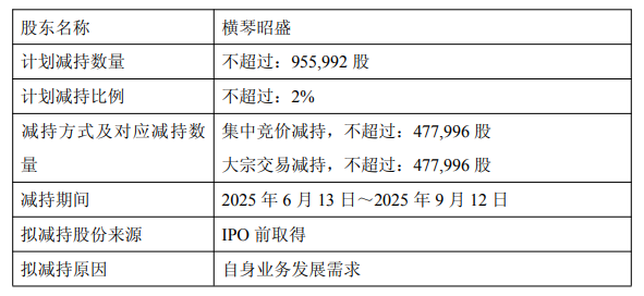 因其自身业务发展需求,横琴昭盛计划通过集中竞价、大宗交易方式减持其持有的公司股份不超过955,992股,减持比例不超过公司总股本的2%,自减持股份计划公告披露之日起15个交易日后的3个月内进行。其中:拟通过集中竞价方式减持不超过477,996股,即不超过公司总股本的1.00%,且任意连续90日减持股份总数不超过公司总股本的1.00%;拟通过大宗交易方式减持不超过477,996股,即不超过公司总股本的1.00%,且任意连续90日减持股份总数不超过公司总股本的2.00%。
