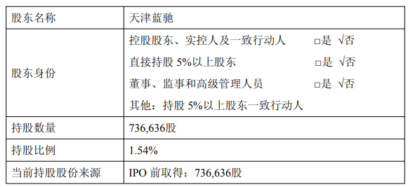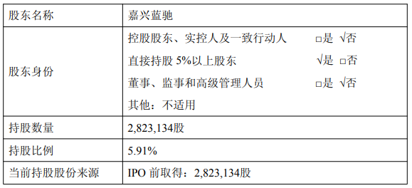 截至公告披露日,嘉兴蓝驰、天津蓝驰分别持有公司2,823,134股、736,636股,分别占公司总股本的5.91%、1.54%。嘉兴蓝驰、天津蓝驰为一致行动人,合计持有公司3,559,770股,占公司总股本的7.45%。上述股份为公司首次公开发行前取得的股份,已于2022年3月16日解除限售并上市流通。