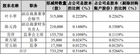公司本次拟减持股份的部分高级管理人员、监事合计持股2,933,000股,占公司总股本的2.0673%(占剔除公司回购专用账户中的股份数量后总股本的2.1064%);计划通过集合竞价方式合计拟减持股份总数为733,250股,占公司总股本的0.5168%(占剔除公司回购专用账户中的股份数量后总股本的0.5266%)。