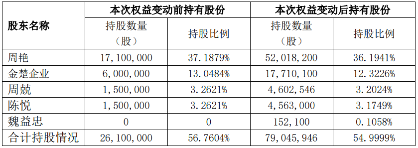 2024年6月6日,公司实施完毕2023年度权益分派方案,以资本公积金向全体股东每10股转增3股,公司总股本由110,553,905股变更为143,720,076股,信息披露义务人的持股数量因此增加至79,587,846股,占公司总股本的55.3770%,持股比例保持不变。