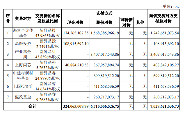 沪硅产业拟向海富半导体基金发行股份及支付现金购买其持有的新昇晶投43.9863%股权,拟向晶融投资支付现金购买其持有的新昇晶投2.7491%股权,拟向产业基金二期发行股份购买其持有的新昇晶科43.8596%股权,拟向上海闪芯发行股份及支付现金购买其持有的新昇晶科5.2632%股权,拟向中建材新材料基金发行股份购买其持有的新昇晶睿24.8780%股权,拟向上国投资管发行股份购买其持有的新昇晶睿14.6341%股权,拟向混改基金发行股份购买其持有的新昇晶睿9.2683%股权。