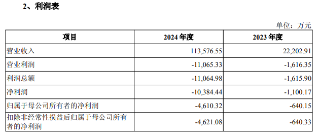 新昇晶科最近两年经审计的合并报表主要财务数据及财务指标如下,2023年度与2024年度,营业收入分别为2.22亿元、11.36亿元,归母净利润分别为-1253.29万元、-8991.02万元,扣非净利润分别为-1253.63万元、-9012.17万元。