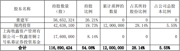 截至公告披露日,翔湾投资及其一致行动人公司控股股东、实际控制人董建军、上海牧鑫资产管理有限公司——牧鑫青铜2号私募证券投资基金合计持有公司股份116,890,424股,占公司当前总股本的54.08%。本次延长质押期限后,翔湾投资及其一致行动人累计质押股份12,000,000股,占其合计持有公司股份的10.27%,占公司当前总股本的5.55%。