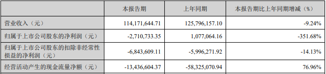 2025年一季度报告显示,今年首季,公司实现营业收入11,417.16万元,比去年同期下降9.24%;实现归属于上市公司股东的净利润-271.07万元,比去年同期下降351.68%;实现归属于上市公司股东的扣除非经常性损益的净利润-684.36万元,上年同期为-599.63万元;经营性现金流量净额为-1,343.66万元,上年同期为-5,832.51万元。