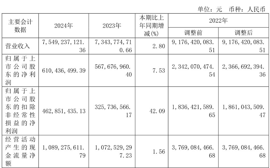 2024年,安通控股实现营业收入75.49亿元,同比增长2.80%;归属于上市公司股东的净利润6.1亿元,同比增长7.53%;归属于上市公司股东的扣非净利润4.63亿元,同比增长42.09%;经营活动产生的现金流量净额为10.89亿元,同比增长1.56%。