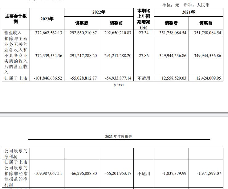 2021年、2022年、2023年,公司实现归属于上市公司股东的净利润1255.85万元、-5502.88万元、-1.02亿元;实现归属于上市公司股东的扣除非经常性损益的净利润-183.74万元、-6629.69万元、-1.10亿元。