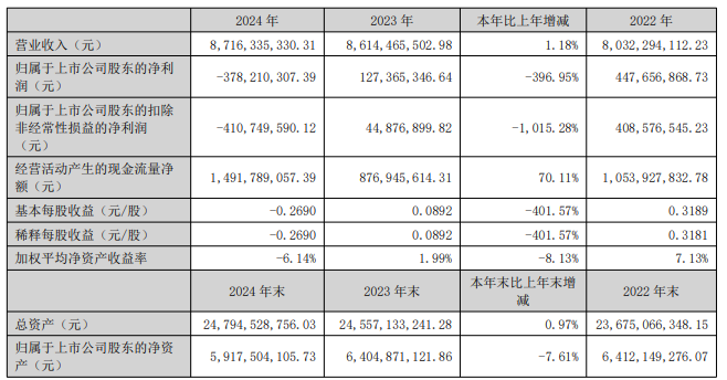 清新环境2024年年度报告显示,清新环境报告期内营业总收入为87.16亿元,同比增长1.18%;归属于上市公司股东的净利润为-3.78亿元,去年同期为1.27亿元;归属于上市公司股东的扣除非经常性损益的净利润为-4.11亿元,去年同期为4487.69万元;经营活动产生的现金流量净额为14.92亿元。