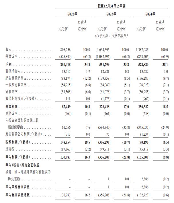2022年、2023年、2024年,手回集团的收入分别为8.06亿元、16.34亿元、13.87亿元;年内利润分别为1.31亿元、-3.56亿元、-1.36亿。