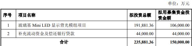 本次向特定对象发行股票募集资金总额不超过150,000.00万元(含本数),扣除发行费用后的净额拟投资于玻璃基Mini LED显示背光模组项目、补充流动资金及偿还银行贷款。