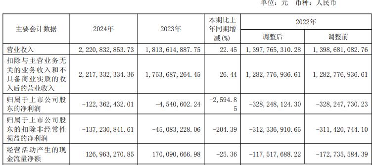 据沃格光电2024年年报,2024年,公司归属于上市公司股东的净利润-1.22亿元,2023年为-454.06万元,2022年为-3.28亿元;扣除非经常性损益后的净利润-1.37亿元,2023年为-4508.32万元,2022年为-3.12亿元。