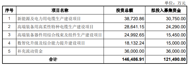 华菱线缆于4月16日发布的《2023年度向特定对象发行A股股票募集说明书(修订稿)》显示,本次向特定对象发行股票募集资金总额不超过121,490.00万元(含本数),扣除发行费用后的募集资金净额将用于下述项目:新能源及电力用电缆生产建设项目、高端装备用高柔性特种电缆生产建设项目、高端装备器件用综合线束及组件生产建设项目、数智化升级及综合能力提升建设项目、补充流动资金。