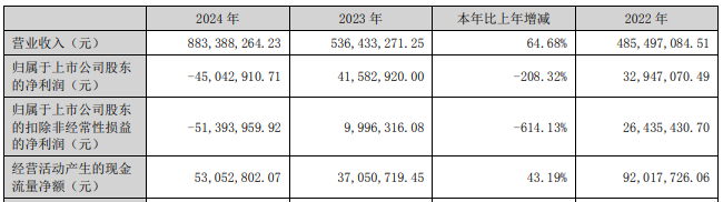 2024年,因赛集团实现营业收入8.83亿元,同比增长64.68%;归属于上市公司股东的净利润为-4,504.29万元,上年同期为4,158.29万元;归属于上市公司股东的扣除非经常性损益的净利润为-5,139.40万元,上年同期为999.63万元;经营活动产生的现金流量净额为5,305.28万元,同比增长43.19%。