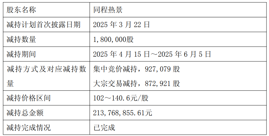 近日,公司收到同程热景出具的《股份减持结果告知函》,同程热景在减持计划期间内通过集中竞价及大宗交易方式合计减持所持公司股份1,800,000股,本次减持计划已完成。根据公告披露,同程热景本次减持套现2.14亿元。