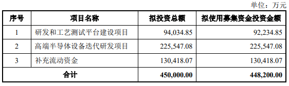 盛美上海于5月22日发布的《2024年度向特定对象发行A股股票预案(二次修订稿)》显示,本次向特定对象发行股票募集资金总额不超过448,200.00万元(含本数),扣除发行费用后,募集资金净额拟投入以下项目:研发和工艺测试平台建设项目、高端半导体设备迭代研发项目、补充流动资金。
