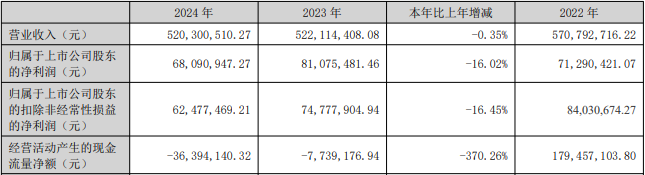 2024年,汇成真空实现营业收入5.20亿元,同比减少0.35%;归属于上市公司股东的净利润6809.09万元,同比减少16.02%;归属于上市公司股东的扣除非经常性损益的净利润6247.75万元,同比减少16.45%;经营活动产生的现金流量净额-3639.41万元,上年同期为-773.92万元。