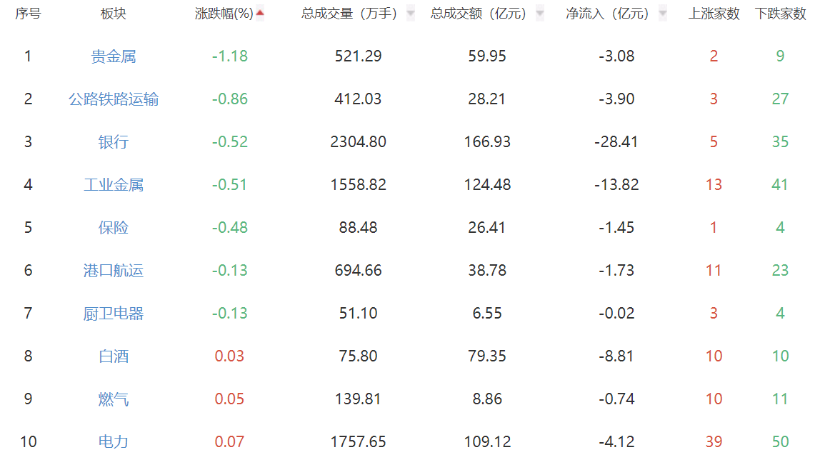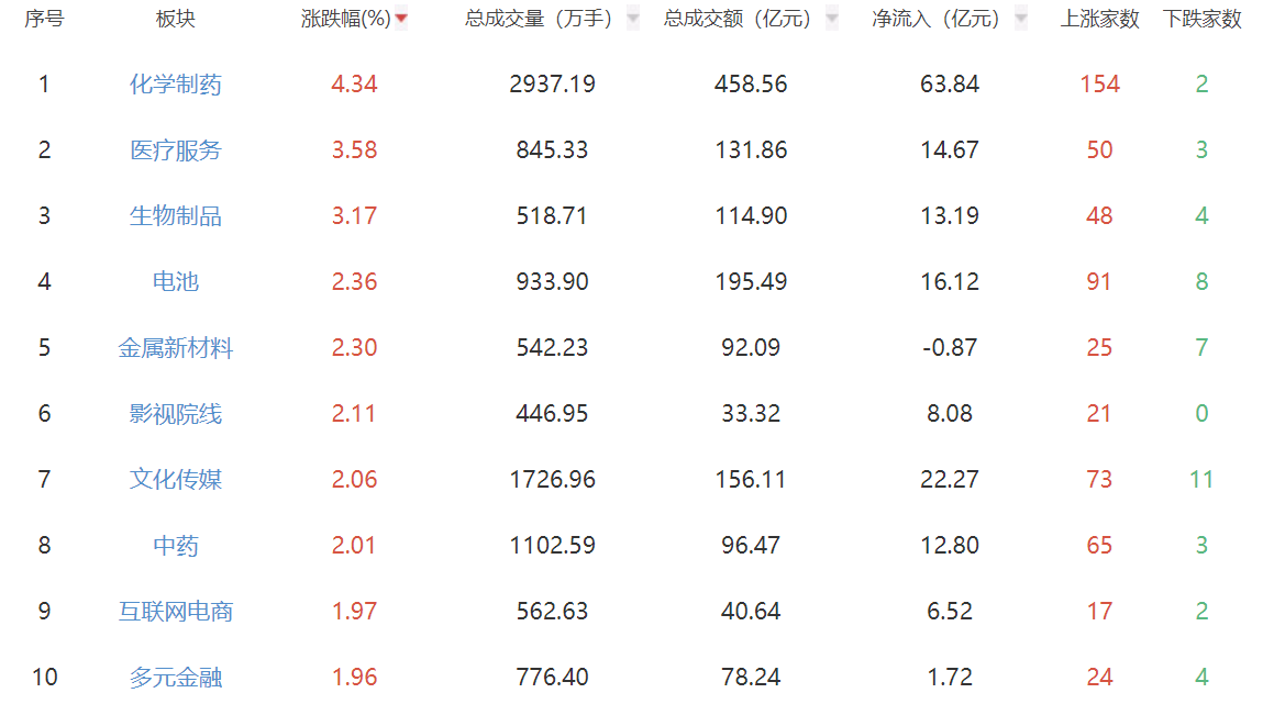 板块方面,化学制药、生物制品等板块涨幅居前,贵金属、公路铁路运输等板块跌幅居前。