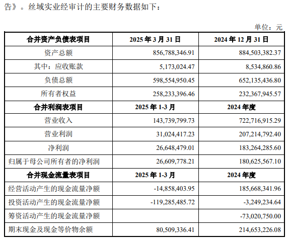 2024年,2025年1-3月,丝域实业经审计的营业收入分别为7.23亿元、1.44亿元,归属于母公司所有者的净利润分别为1.81亿元、0.27亿元,经营活动产生的现金流量净额分别为1.86亿元、-0.15亿元。