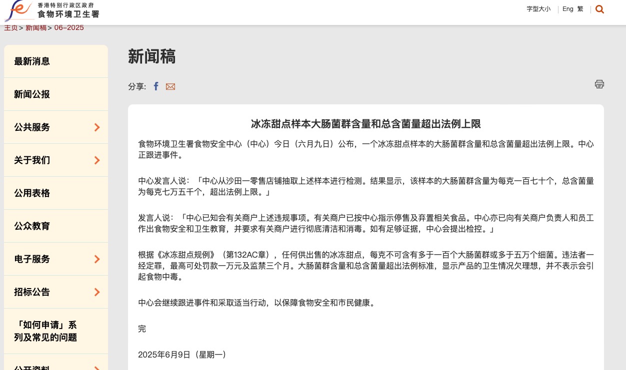 近日,香港特别行政区政府食物环境卫生署食物安全中心公布,一个冰冻甜点样本的大肠菌群含量和总含菌量超出法例上限。多家港媒报道,该门店为蜜雪冰城。