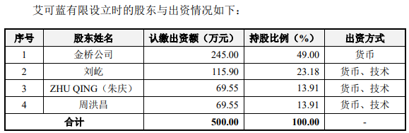 艾可蓝2020年1月15日披露的招股书显示,ZHUQING(朱庆),为公司3名核心技术人员之一,系公司董事、副总经理。公司是由安徽艾可蓝节能环保科技有限公司(以下简称“艾可蓝有限”)整体变更设立的股份有限公司。2009年1月8日,金桥公司与刘屹、ZHUQING(朱庆)、周洪昌签署《中外合作经营企业安徽艾可蓝节能环保科技有限公司合同书》(以下简称“《合同书》”)以及有限公司章程,成立艾可蓝有限,注册资本为500万元人民币。根据《合同书》、有限公司章程以及2009年1月20日签订的《中外合作企业安徽艾可蓝节能环保科技有限公司补充合同》约定,金桥公司以货币出资245万元,占公司注册资本的49%;刘屹出资115.90万元,其中货币出资56.80万元,技术出资59.10万元,合计占公司注册资本23.18%;ZHUQING(朱庆)出资69.55万元,其中货币出资34.10万元,技术出资35.45万元,合计占公司注册资本13.91%;周洪昌出资69.55万元,其中货币出资34.10万元,技术出资35.45万元,合计占公司注册资本13.91%。