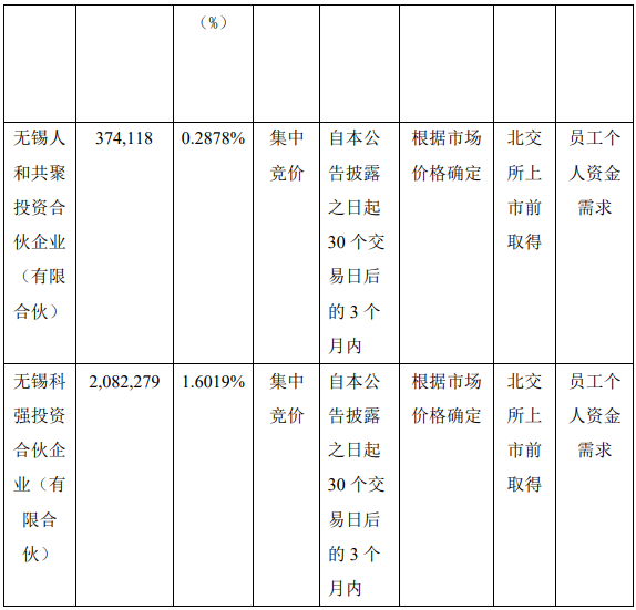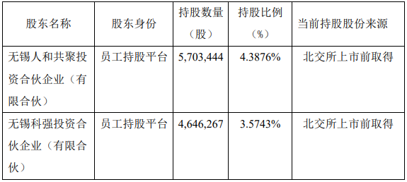 具体来看,无锡人和共聚投资合伙企业(有限合伙)(以下简称“人和共聚”)及无锡科强投资合伙企业(有限合伙)(以下简称“科强投资”)分别计划减持374118股、2082279股,计划减持数量分别占总股本比例的0.2878%、1.6019%。本次拟减持股份来源均为北交所上市前取得,拟减持原因均为员工个人资金需求。