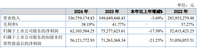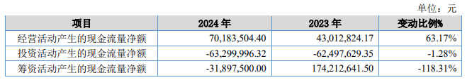2024年,科强股份营业收入为3.37亿元,同比下降3.69%;归属于上市公司股东的净利润0.62亿元,同比下降17.50%;归属于上市公司股东的扣除非经常性损益后的净利润0.56亿元,同比下降21.25%;经营活动产生的现金流量净额0.70亿元,同比增长63.17%。