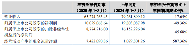 2025年一季度,科强股份营业收入为0.65亿元,同比下降17.65%;归属于上市公司股东的净利润0.10亿元,同比下降49.36%;归属于上市公司股东的扣除非经常性损益后的净利润0.09亿元,同比下降45.68%;经营活动产生的现金流量净额0.07亿元,同比增长587.36%。