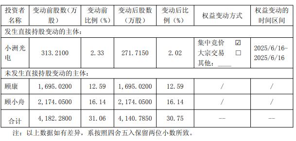 澳华内镜于6月16日收到公司股东顾康、顾小舟及其控制的小洲光电出具的相关权益变动情况的告知函。截至6月16日,小洲光电通过集中竞价交易方式减持公司股份41.4950万股,顾康、顾小舟及其控制的小洲光电合计持有公司股份数量由4,182.2800万股减少至4,140.7850万股,占公司总股本比例由31.06%减少至30.75%,权益变动触及1%刻度。