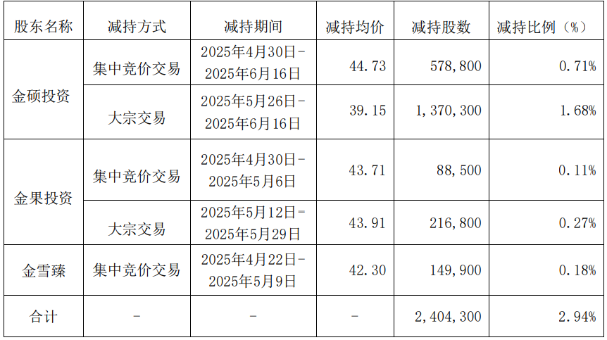 近日公司收到公司实际控制人之一致行动人金硕投资、金果投资、金雪臻出具的《关于减持计划实施完毕的告知函》,金硕投资、金果投资、金雪臻合计减持2,404,300股,减持比例2.94%。