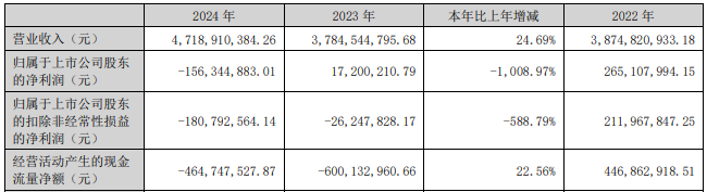 2024年,公司实现营业收入47.19亿元,同比增长24.69%;归属于上市公司股东的净利润为-1.56亿元,上年同期为1720.02万元;归属于上市公司股东的扣除非经常性损益的净利润为-1.81亿元,上年同期为-2624.78万元;经营活动产生的现金流量净额为-4.65亿元,上年同期为-6.00亿元。