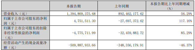 2025年1-3月,公司实现营业收入13.95亿元,同比增长56.29%;归属于上市公司股东的净利润为475.15万元,上年同期为-2769.74万元;归属于上市公司股东的扣除非经常性损益的净利润为-477.57万元,上年同期为-3245.99万元;经营活动产生的现金流量净额为-5.10亿元,上年同期为-3.48亿元。