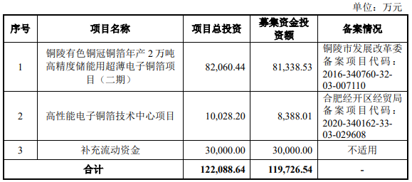 铜冠铜箔首次公开发行募集资金总额为357,927.46万元,募集资金净额为343,012.47万元,较原计划多223285.93万元。公司2022年1月24日披露招股书显示,公司拟募集资金119,726.54万元,计划用于铜陵有色铜冠铜箔年产2万吨高精度储能用超薄电子铜箔项目(二期)、高性能电子铜箔技术中心项目、补充流动资金。