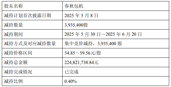据春秋航空公告,2025年5月30日至2025年6月20日,上海春秋包机旅行社有限公司(以下简称“春秋包机”)减持春秋航空3,935,400股,减持价格区间为54.85至59.56元/股,减持总金额为224,821,738.84元。