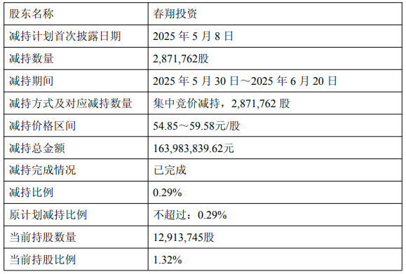 2025年5月30日至2025年6月20日,上海春翔投资有限公司(以下简称“春翔投资”减持春秋航空2,871,762股,减持价格区间为54.85至59.58元/股,减持总金额163,983,839.62元。