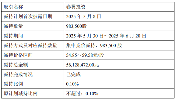 2025年5月30日至2025年6月20日,上海春翼投资有限公司(以下简称“春翼投资”)减持春秋航空983,500股,减持价格区间为54.85至59.58元/股,减持总金额56,128,472.00元。