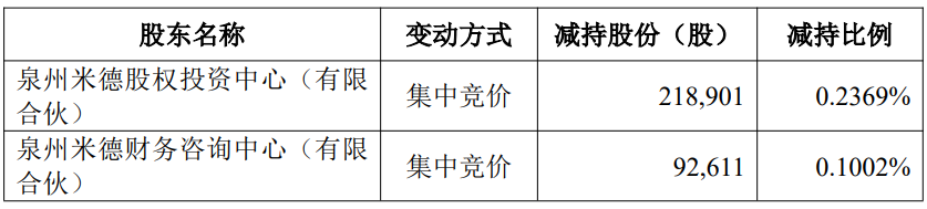 公司于2025年6月20日收到泉州米德股权投资中心(有限合伙)(以下简称“米德股权”)及泉州米德财务咨询中心(有限合伙)(以下简称“米德财务”)出具的《股份减持进展告知书》,2025年5月27日至2025年6月20日,米德股权通过集中竞价交易累计减持公司股票218,901股、米德财务通过集中竞价交易累计减持公司股票92,611股,合计减持311,512股,占公司总股本0.3371%。