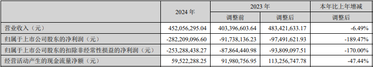 中国经济网北京6月24日讯 百川畅银(300614.SZ)2024年年度报告显示,2024年,公司实现营业收入4.52亿元,同比减少6.49%;归属于上市公司股东的净利润-2.82亿元,上年同期为-9749.16万元;归属于上市公司股东的扣除非经常性损益的净利润-2.53亿元,上年同期为-9380.91万元;经营活动产生的现金流量净额5952.23万元,同比减少47.44%。