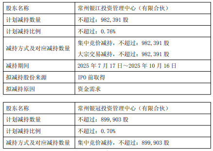 中国经济网北京6月25日讯 银河微电(688689.SH)昨日晚间发布大股东及其一致行动人及董监高减持股份计划公告称,自减持计划公告披露之日起的15个交易日后的3个月内,常州银江投资管理中心(有限合伙)(以下简称“银江投资”)和常州银冠投资管理中心(有限合伙)(以下简称“银冠投资”)拟采用集中竞价、大宗交易两种方式合计减持1,882,294股,占公司总股本的1.46%。董事孟浪拟采用集中竞价方式减持2,250股,占公司总股本的0.002%。