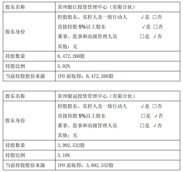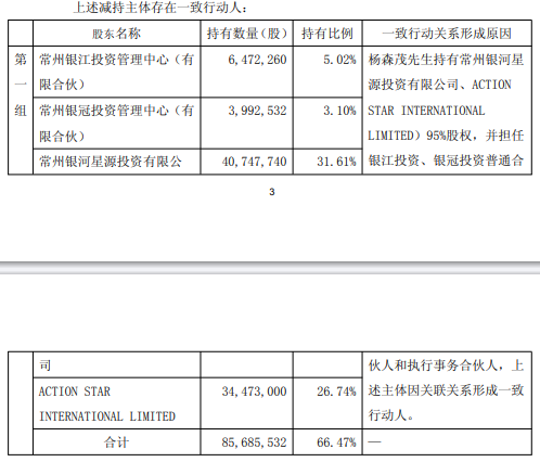 本次减持计划实施前,公司股东常州银河星源投资有限公司持有公司40,747,740股,占公司总股本的31.61%;恒星国际有限公司(ACTIONSTARINTERNATIONALLIMITED)持有公司34,473,000股,占公司总股本的26.74%;银江投资持有公司6,472,260股,占公司总股本的5.02%;银冠投资持有公司3,992,532股,占公司总股本的3.10%。前述四个企业为一致行动人,合计持有公司85,685,532股,占总股本66.47%。以上股份来源于公司首次公开发行前取得的股份,且已于2024年1月29起上市流通。