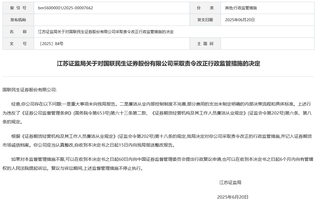 中国经济网北京6月25日讯 江苏证监局网站近日披露了关于对国联民生证券股份有限公司采取责令改正行政监管措施的决定。