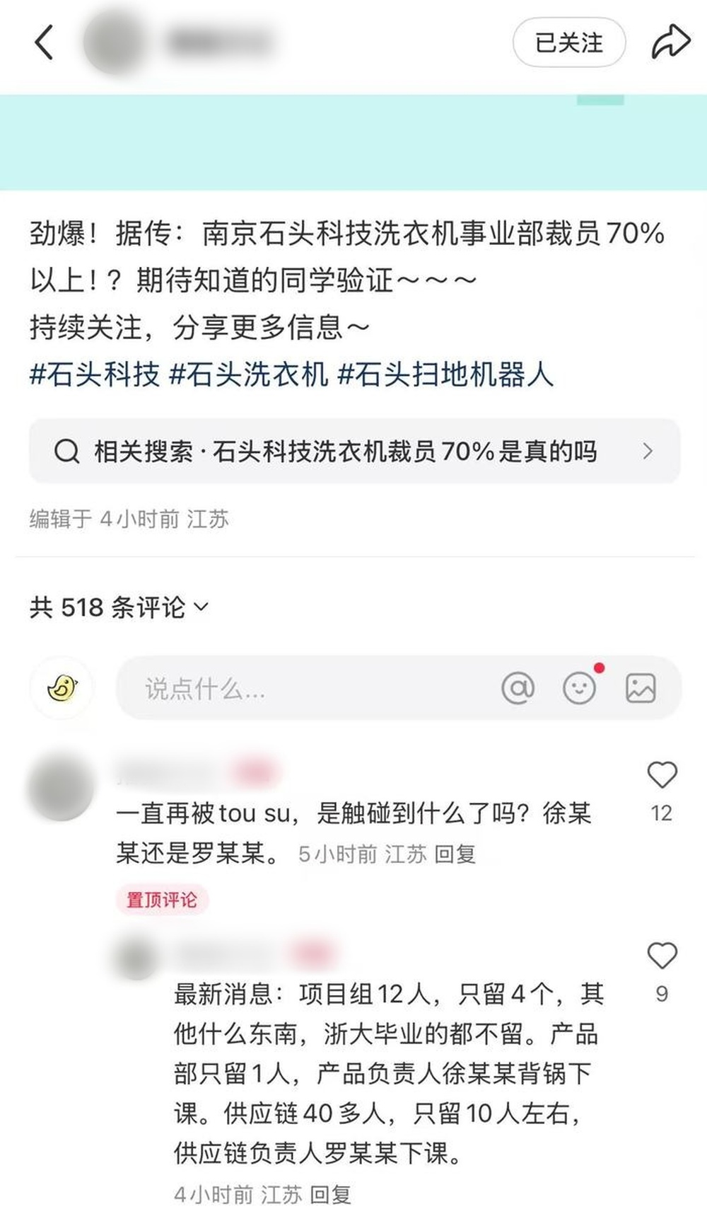 与常见的业务优化不同,网络上流传的关于石头科技此次调整的描述显得异常“突然”。据多个信息源,来自社交平台“小红书”上自称是当事员工的用户爆料,此次裁员比例可能高达70%至90%。