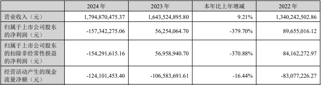中国经济网北京6月26日讯 飞沃科技(301232.SZ)2024年年度报告显示,去年,公司实现营业收入17.95亿元,同比增长9.21%;归属于上市公司股东的净利润-1.57亿元,同比减少379.70%;归属于上市公司股东的扣除非经常性损益的净利润-1.54亿元,同比减少370.88%;经营活动产生的现金流量净额-1.24亿元,上年同期为-1.07亿元。