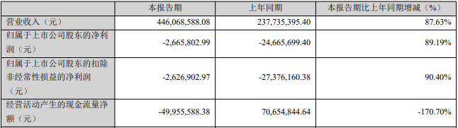 2025年一季度报告显示,今年首季,公司实现营业收入4.46亿元,同比增长87.63%;归属于上市公司股东的净利润-266.58万元,上年同期为-2466.57万元;归属于上市公司股东的扣除非经常性损益的净利润-262.69万元,上年同期为-2737.62万元;经营活动产生的现金流量净额-4995.56万元,同比减少170.70%。