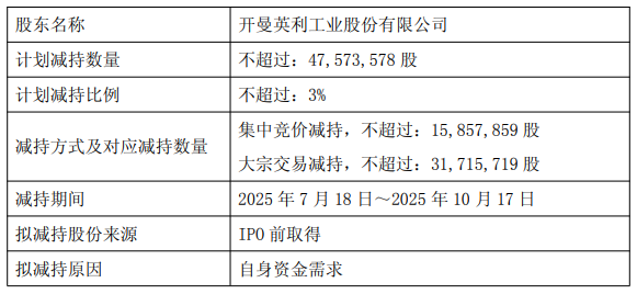开曼英利拟通过集中竞价交易和大宗交易方式减持公司股份合计不超过47,573,578股,即不超过公司总股本的3%。其中,通过集中竞价交易方式减持,在任意连续90日内,减持股份的总数不超过公司股份总数的1%,即不超过15,857,859股;采取大宗交易方式减持,在任意连续90日内,减持股份的总数不超过公司股份总数的2%,即不超过31,715,719股。减持期间为:自公告披露日起15个交易日后的3个月内。(若减持计划实施期间内,发生送股、资本公积金转增股本等股份变动事项,减持股份数量进行相应调整。)