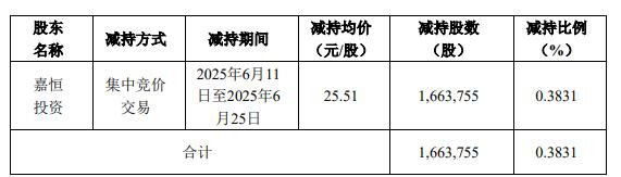 公告显示,6月11日至6月25日,嘉恒投资通过集中竞价交易减持1,663,755股,减持均价25.51元/股。经计算,嘉恒投资减持金额4244.24万元。